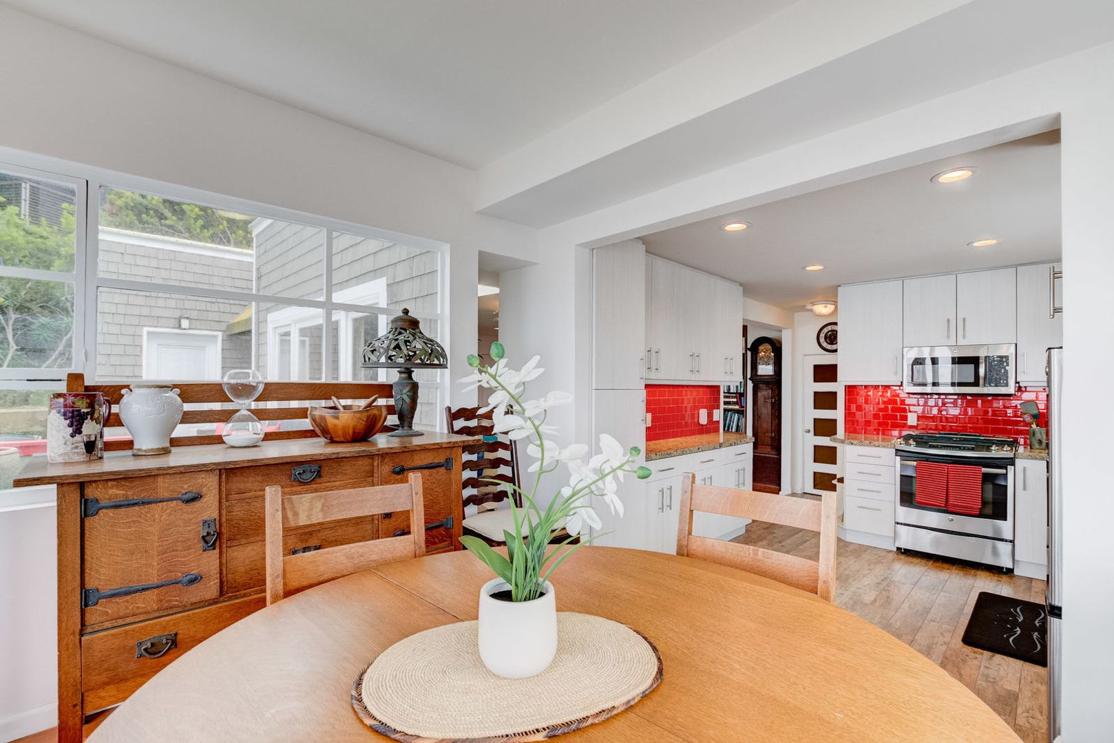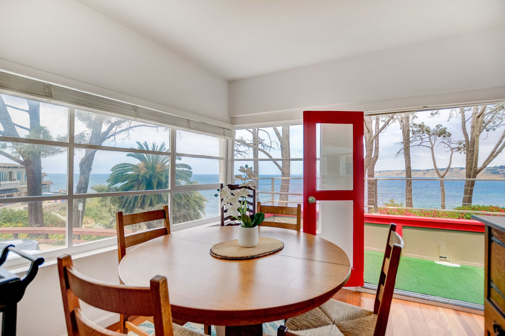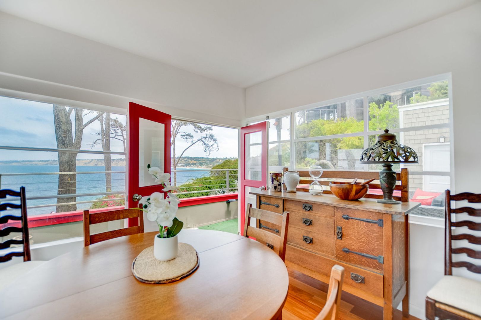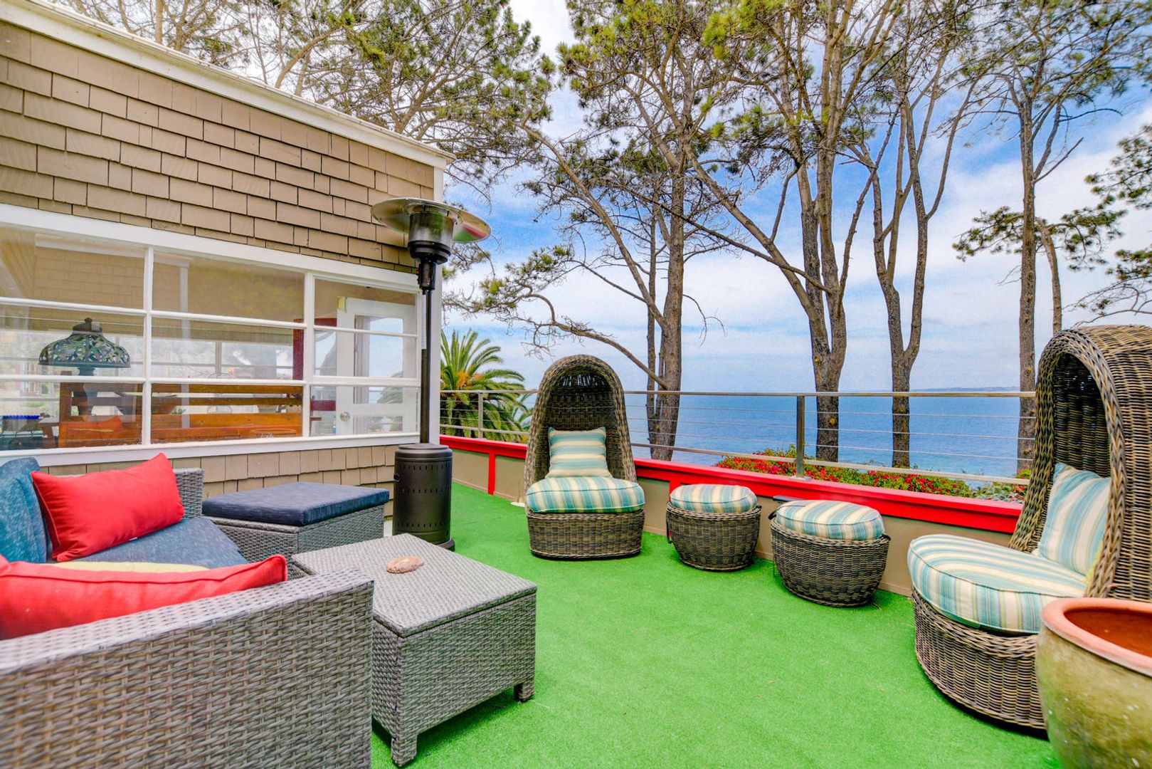 The spacious living room is perfect for relaxing and hanging out. Enjoy the flat screen TV or lots of books and board games! You're just a step away from the fully stocked kitchen and another patio area that overlooks the ocean and the walkway to the cliffs overlooking the cove! This patio has even more comfortable lounge seating as well as another heat lamp. The dining room table can seat up to 6 and is the perfect spot to have your morning coffee or enjoy the sunset from the large windows.