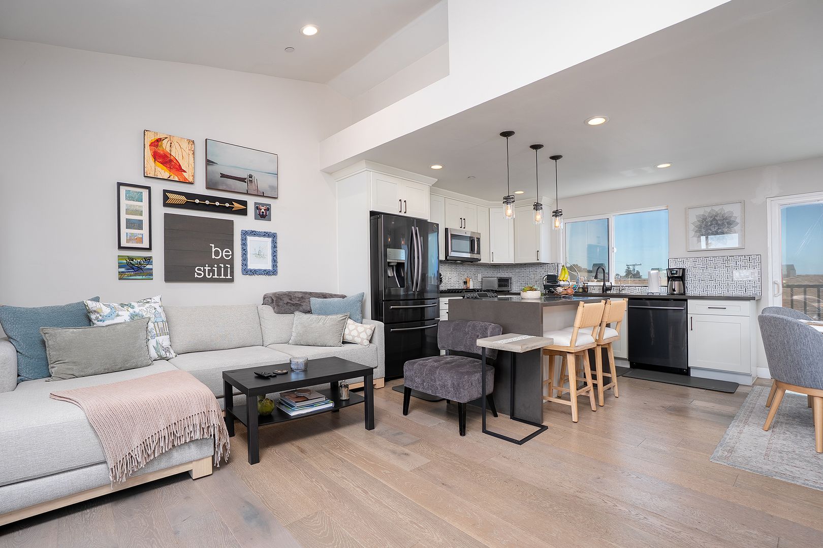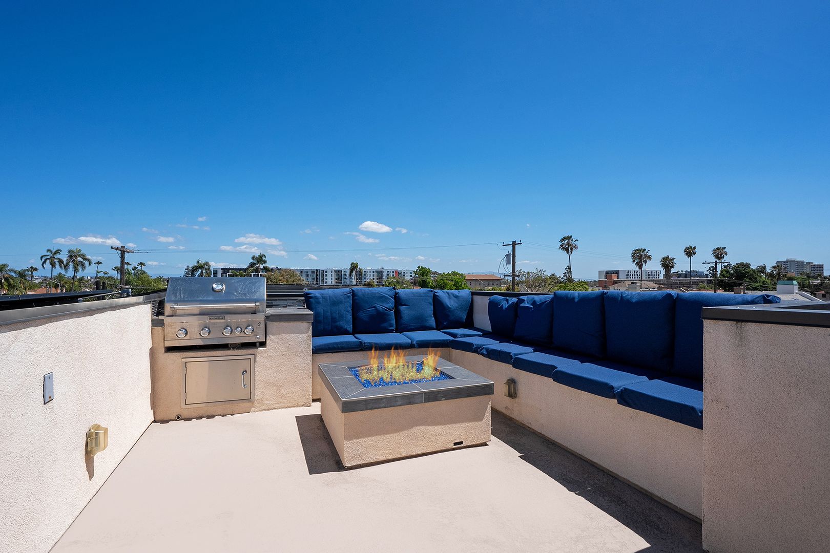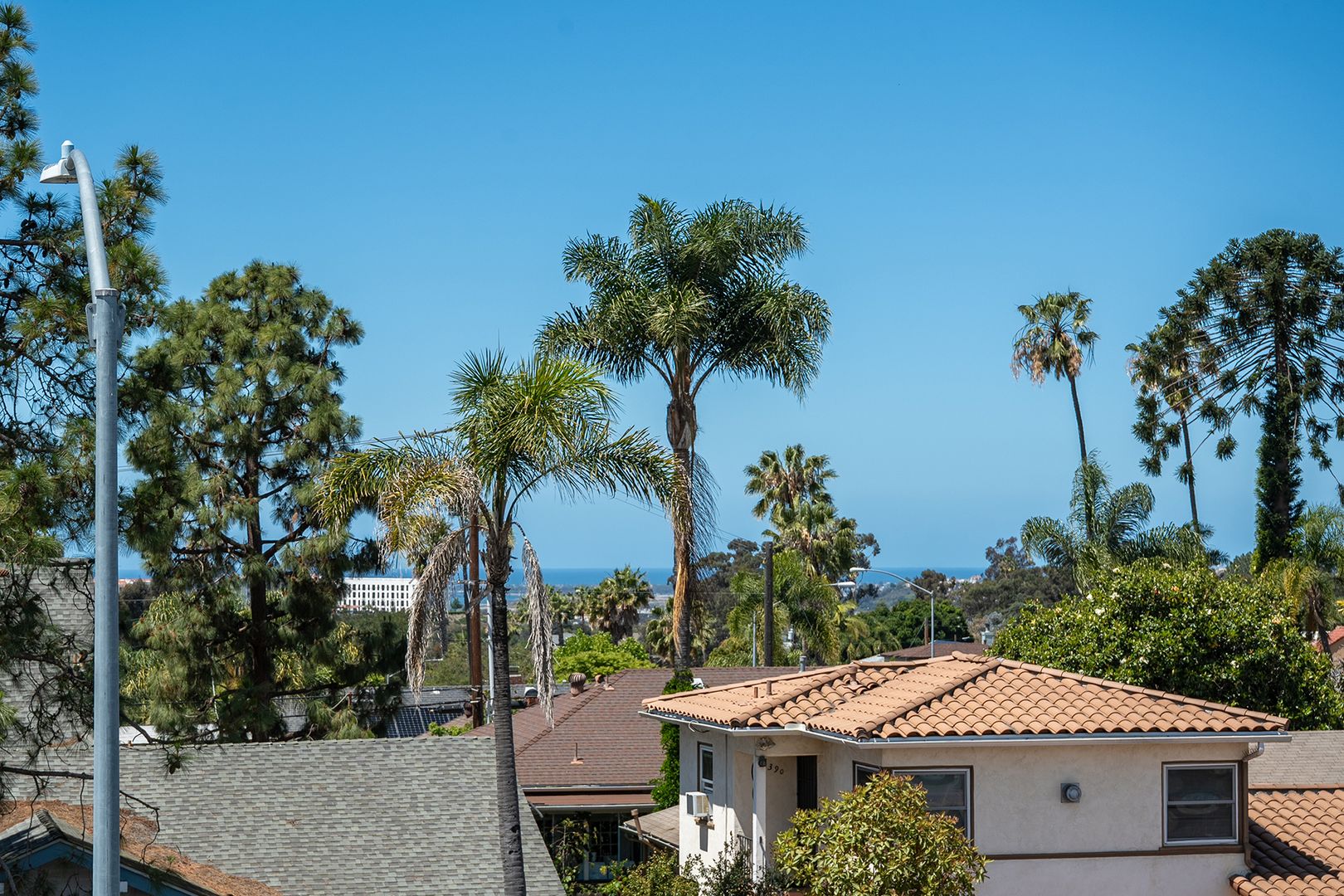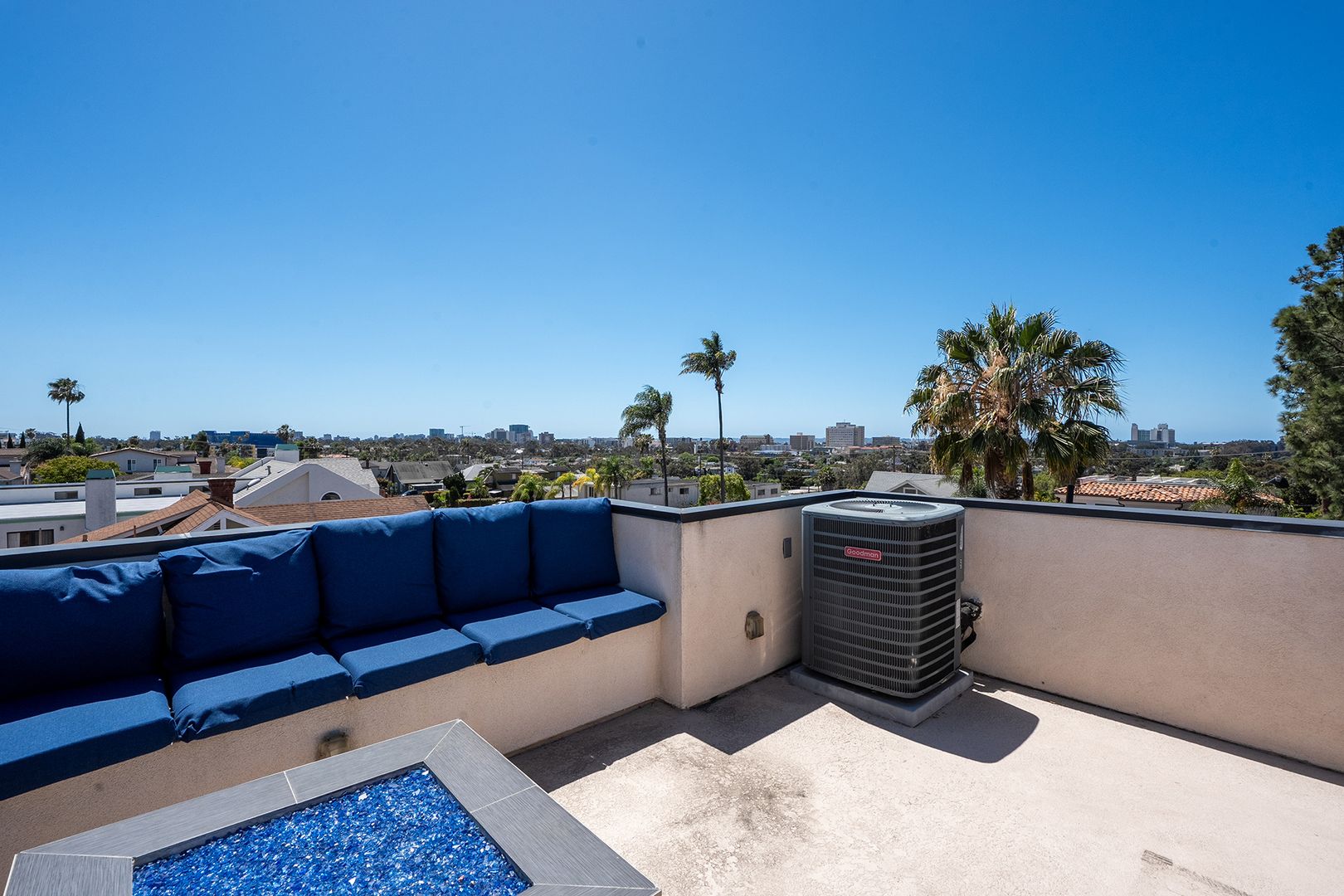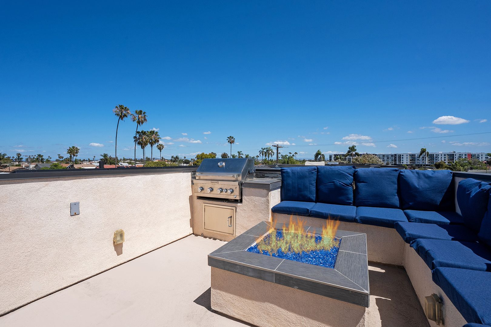 Featuring 4 well-planned levels with wood floors throughout. The entryway and garage on the bottom floor, 3 bedrooms, 2 full bathrooms, and laundry are on the 2nd floor, and the living room, kitchen, and a 1/2 bath on the 3rd floor. The 4th floor is a private rooftop balcony, the perfect spot to enjoy San Diego's beautiful weather. Featuring a built-in gas fire pit and gas barbecue grill, take in the stunning views all the way to the ocean.