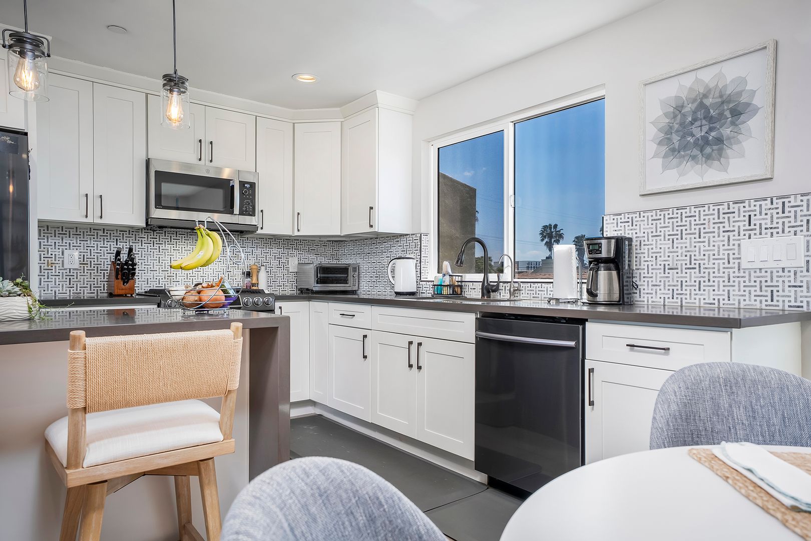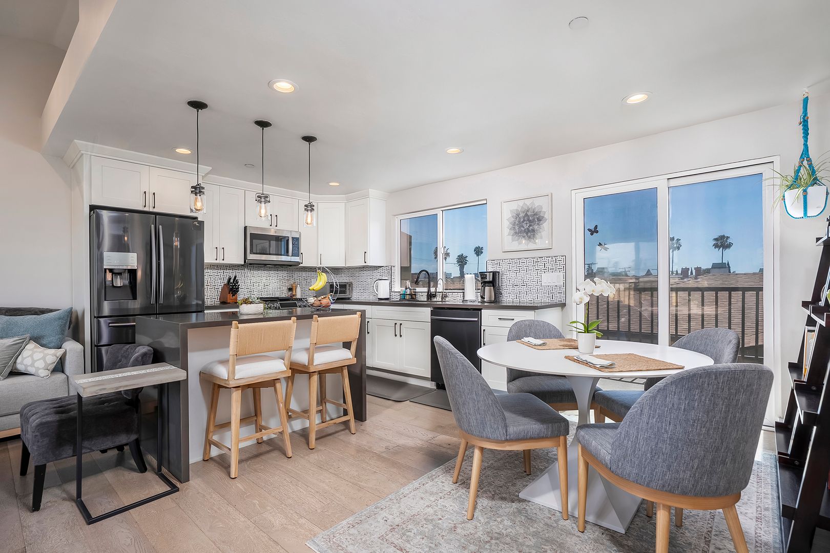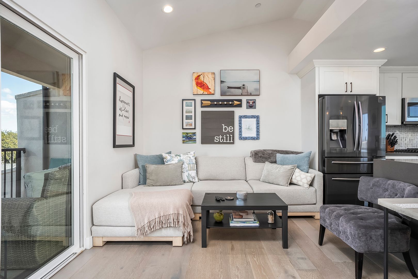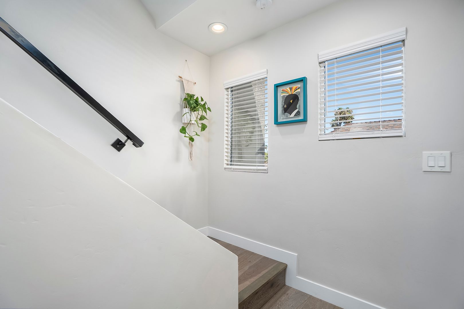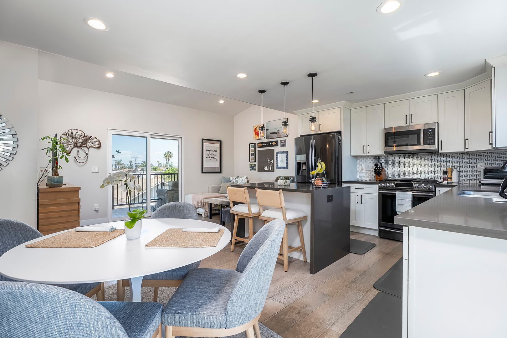 Featuring 4 well-planned levels with wood floors throughout. The entryway and garage on the bottom floor, 3 bedrooms, 2 full bathrooms, and laundry are on the 2nd floor, and the living room, kitchen, and a 1/2 bath on the 3rd floor. The 4th floor is a private rooftop balcony, the perfect spot to enjoy San Diego's beautiful weather. Featuring a built-in gas fire pit and gas barbecue grill, take in the stunning views all the way to the ocean.