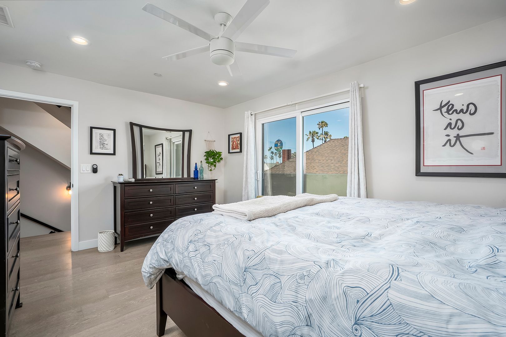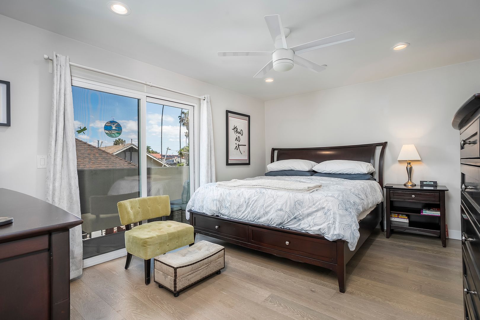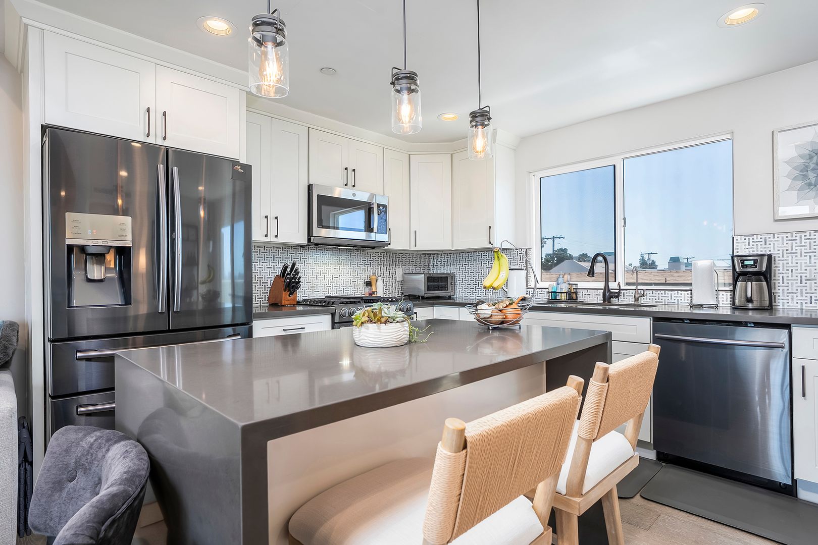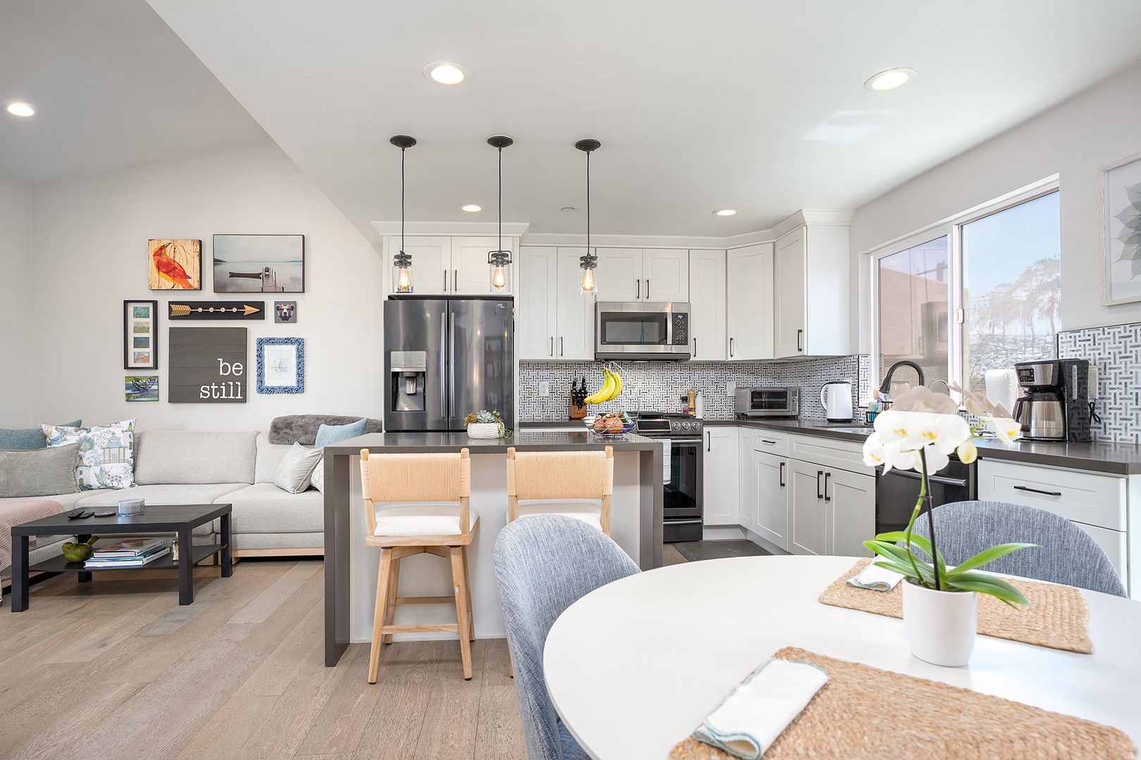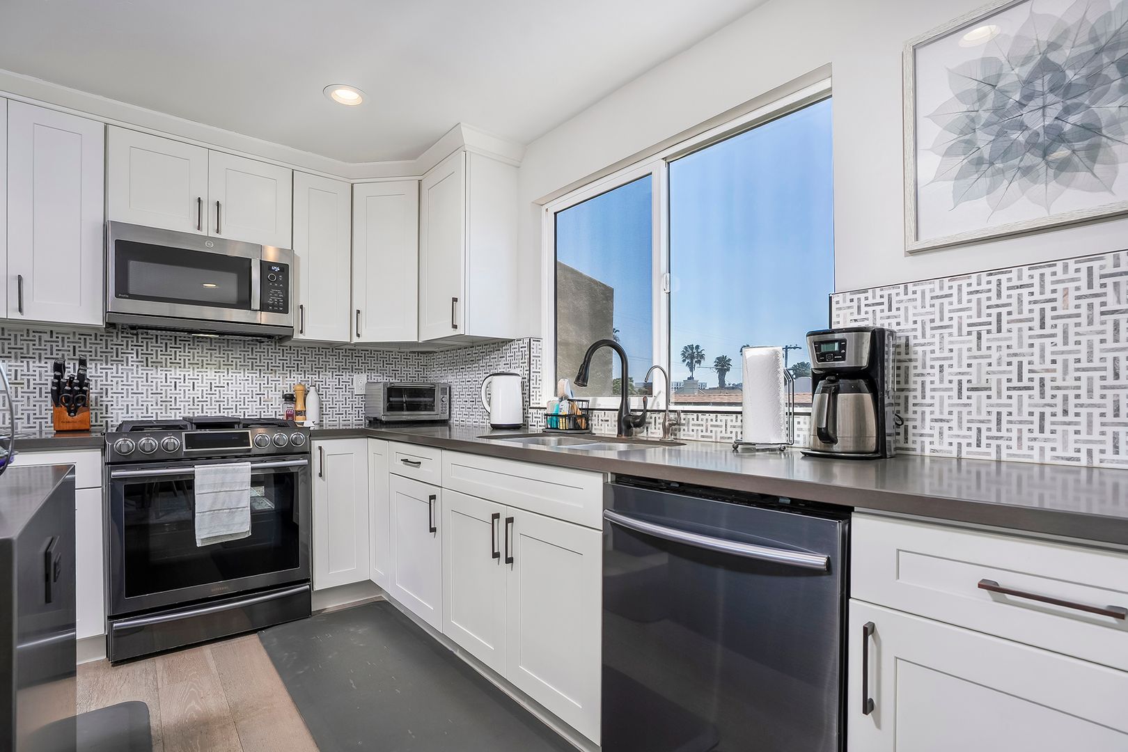 Featuring 4 well-planned levels with wood floors throughout. The entryway and garage on the bottom floor, 3 bedrooms, 2 full bathrooms, and laundry are on the 2nd floor, and the living room, kitchen, and a 1/2 bath on the 3rd floor. The 4th floor is a private rooftop balcony, the perfect spot to enjoy San Diego's beautiful weather. Featuring a built-in gas fire pit and gas barbecue grill, take in the stunning views all the way to the ocean.