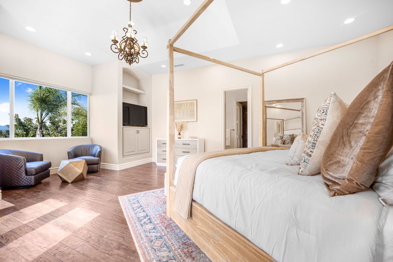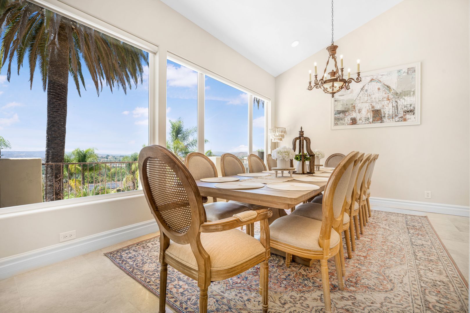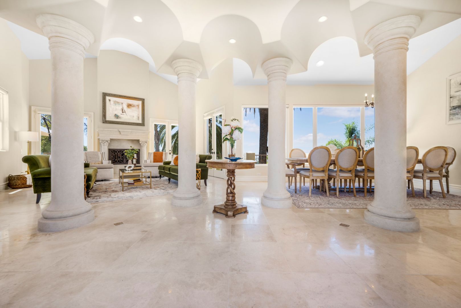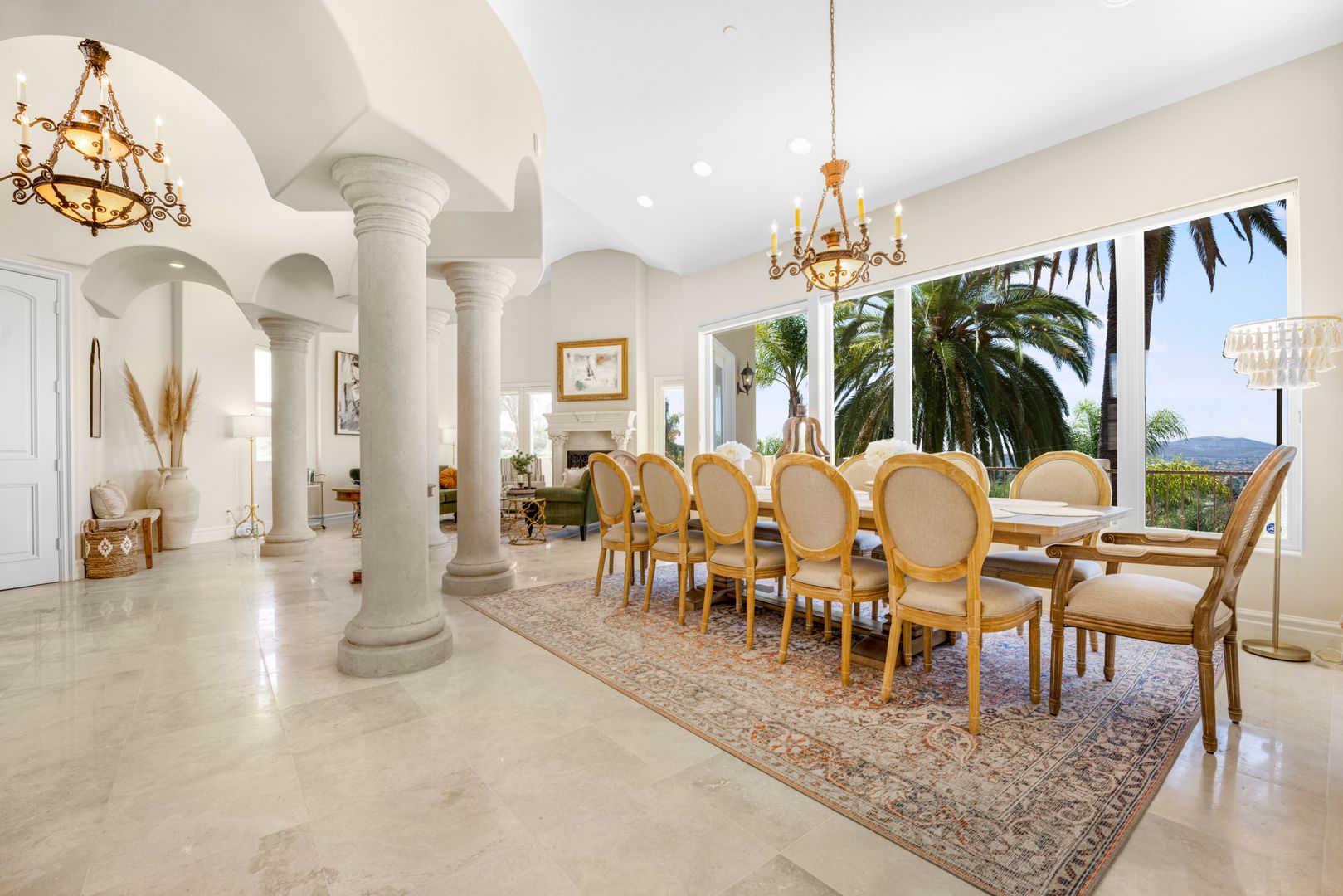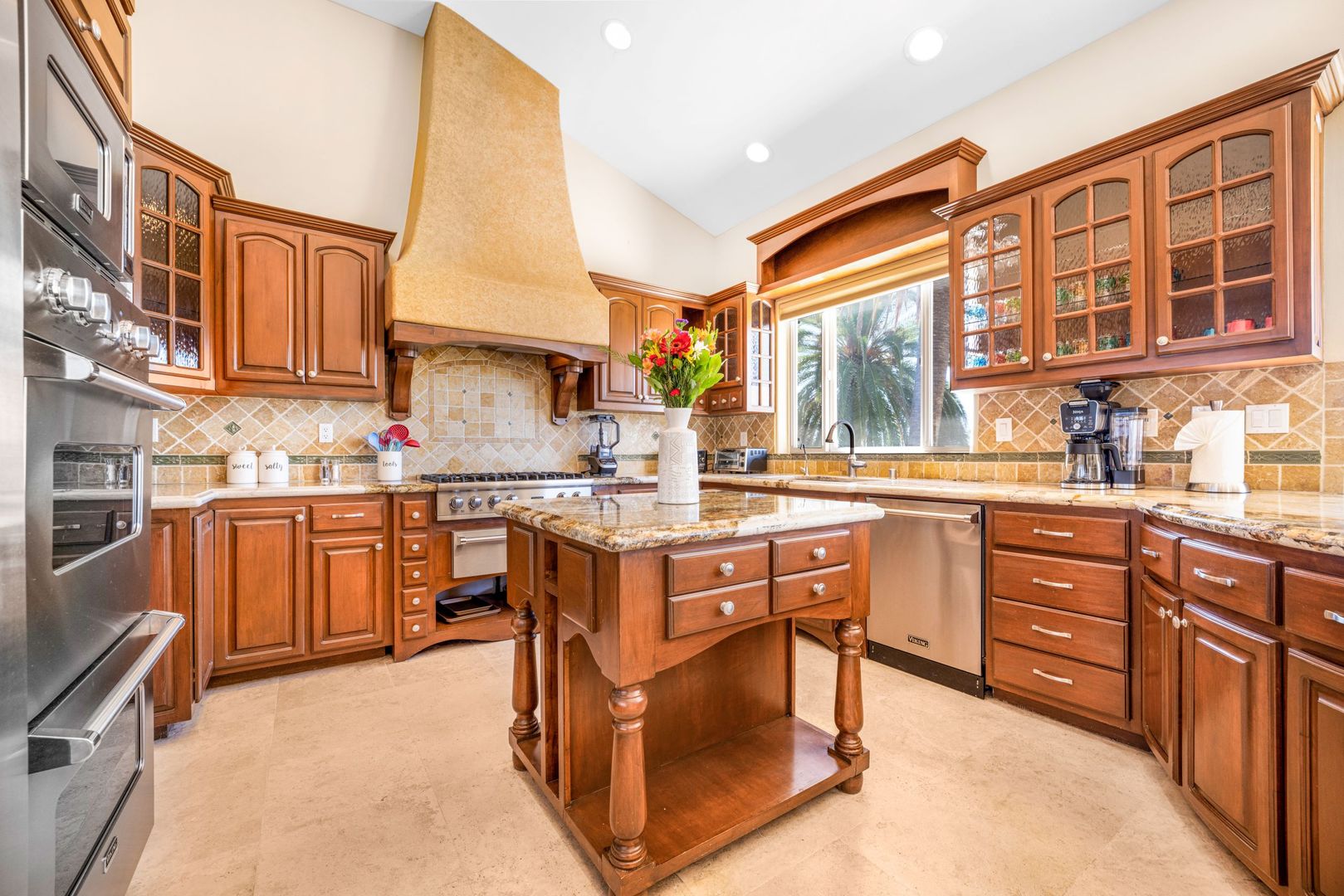 As you enter the 5062 square foot home you’ll be in awe of the high ceilings, the gorgeous columns and arches in the rotunda and the exquisite attention to detail throughout. Large east and west facing windows bring in generous natural light to enjoy the beautiful California sunshine. Just outside the living and family room is a spacious 1000 square foot balcony accessed by multiple sets of french doors to enjoy the views. The chef’s kitchen with stainless steel appliances features an extra-large fridge, double ovens perfect for creating large meals for party guests, an island in the center of the kitchen and serving counter just off the dining nook. You may choose to have an informal meal right there by the kitchen or take advantage of the beautiful 12 person dining table for a classy dinner just around the corner.