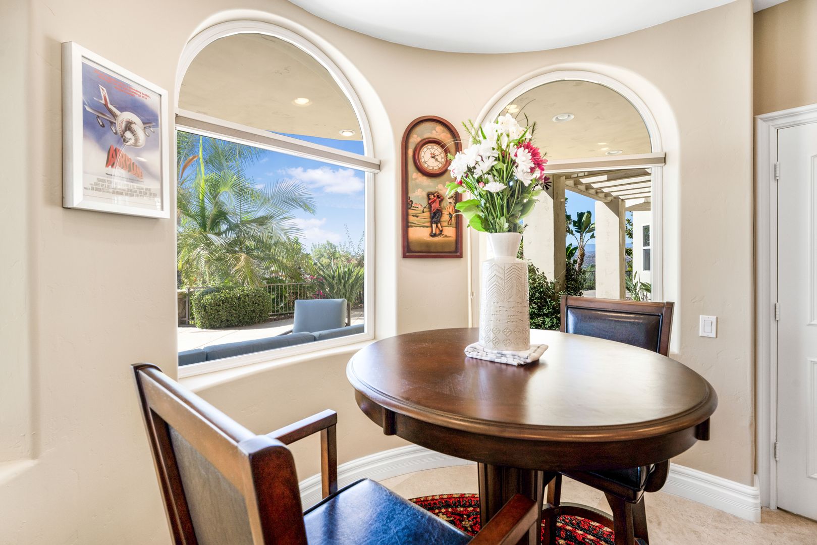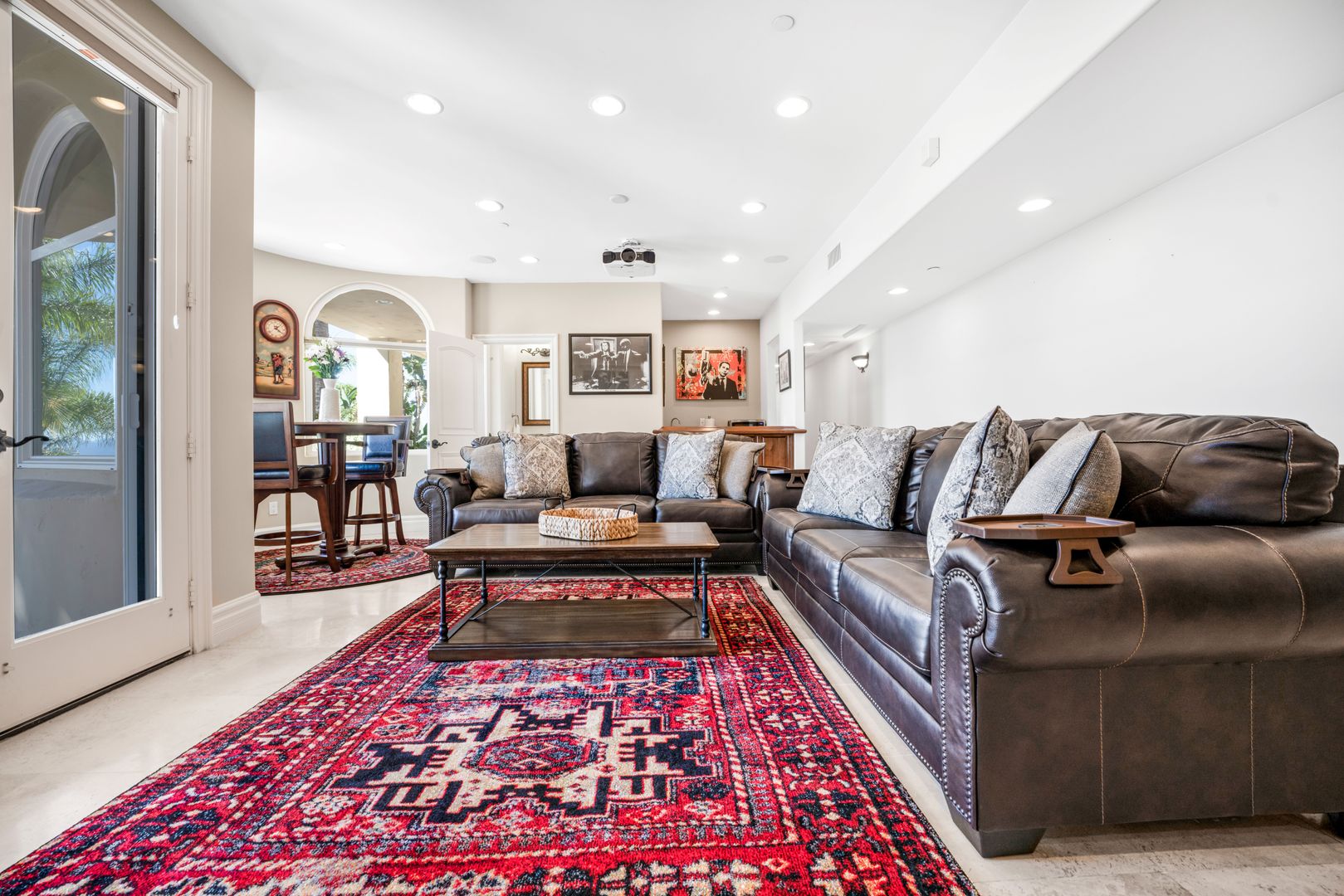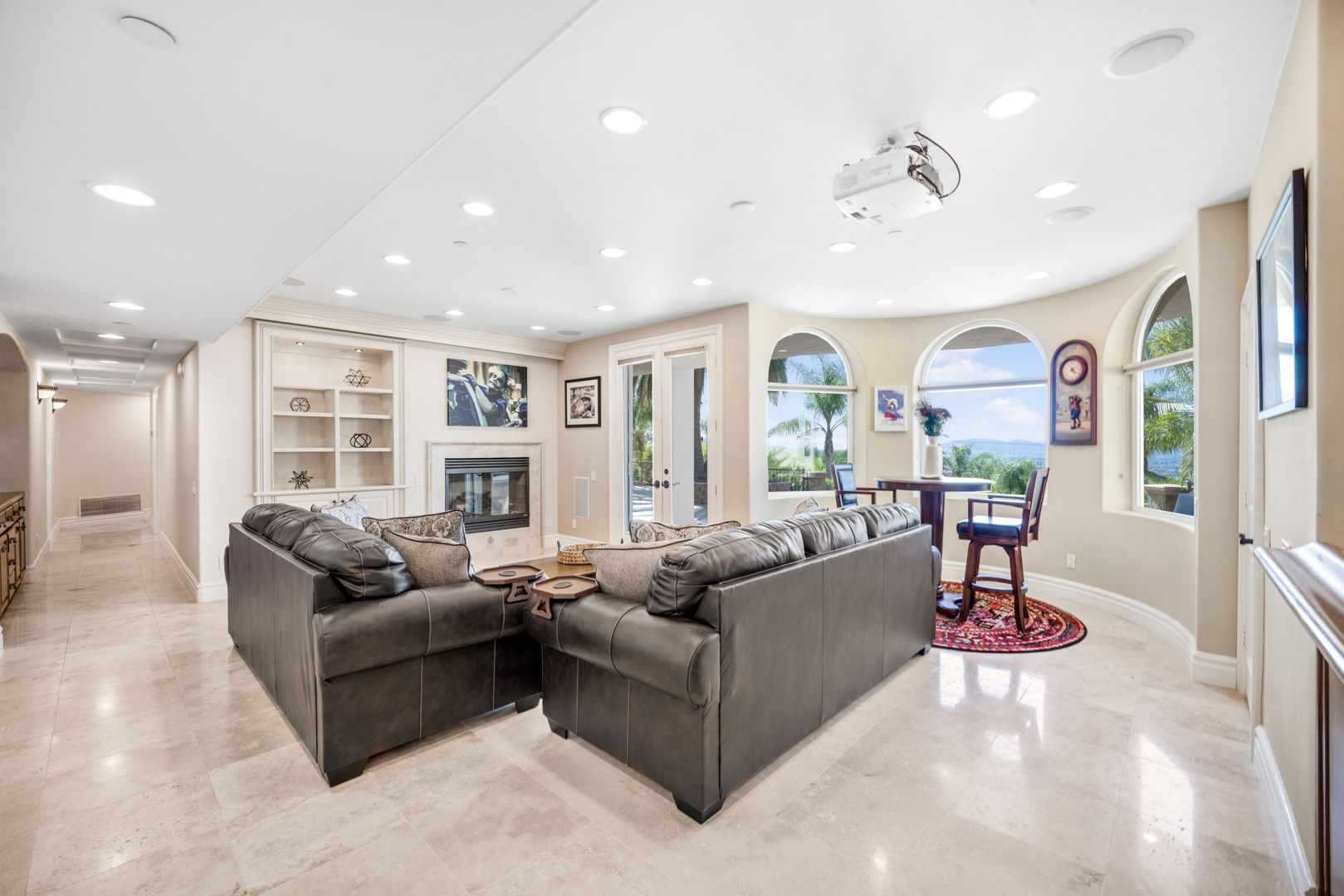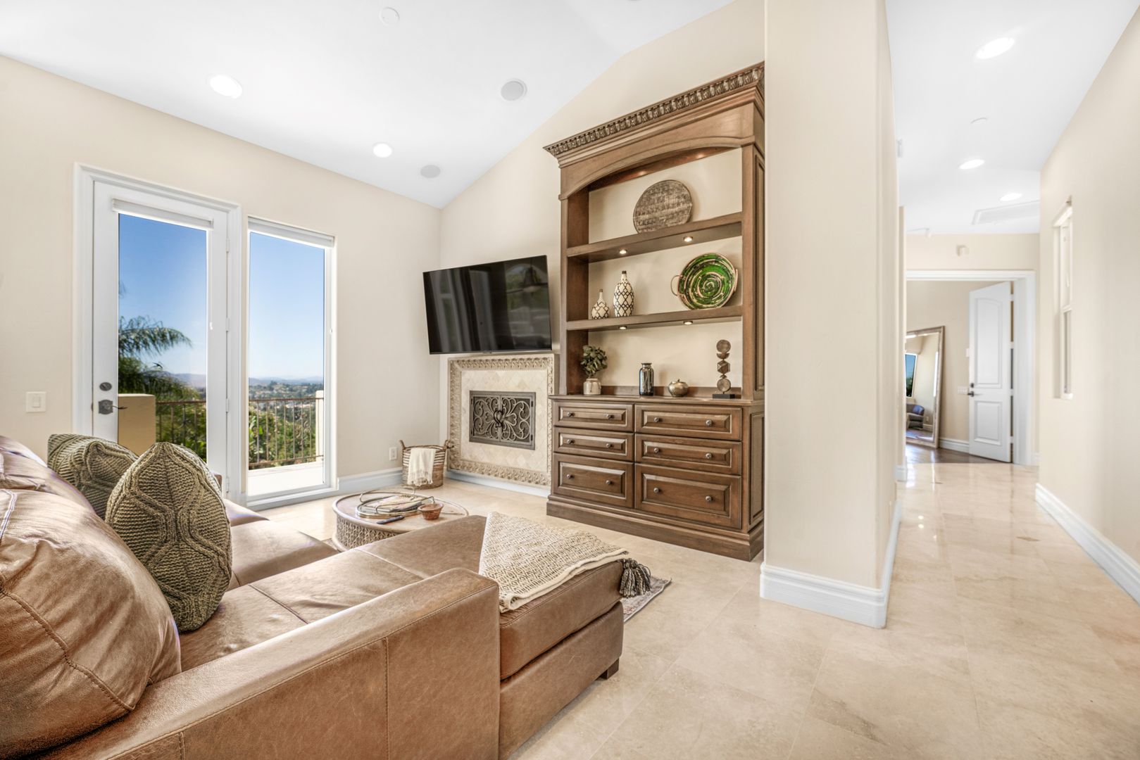 As you enter the 5062 square foot home you’ll be in awe of the high ceilings, the gorgeous columns and arches in the rotunda and the exquisite attention to detail throughout. Large east and west facing windows bring in generous natural light to enjoy the beautiful California sunshine. Just outside the living and family room is a spacious 1000 square foot balcony accessed by multiple sets of french doors to enjoy the views. The chef’s kitchen with stainless steel appliances features an extra-large fridge, double ovens perfect for creating large meals for party guests, an island in the center of the kitchen and serving counter just off the dining nook. You may choose to have an informal meal right there by the kitchen or take advantage of the beautiful 12 person dining table for a classy dinner just around the corner.