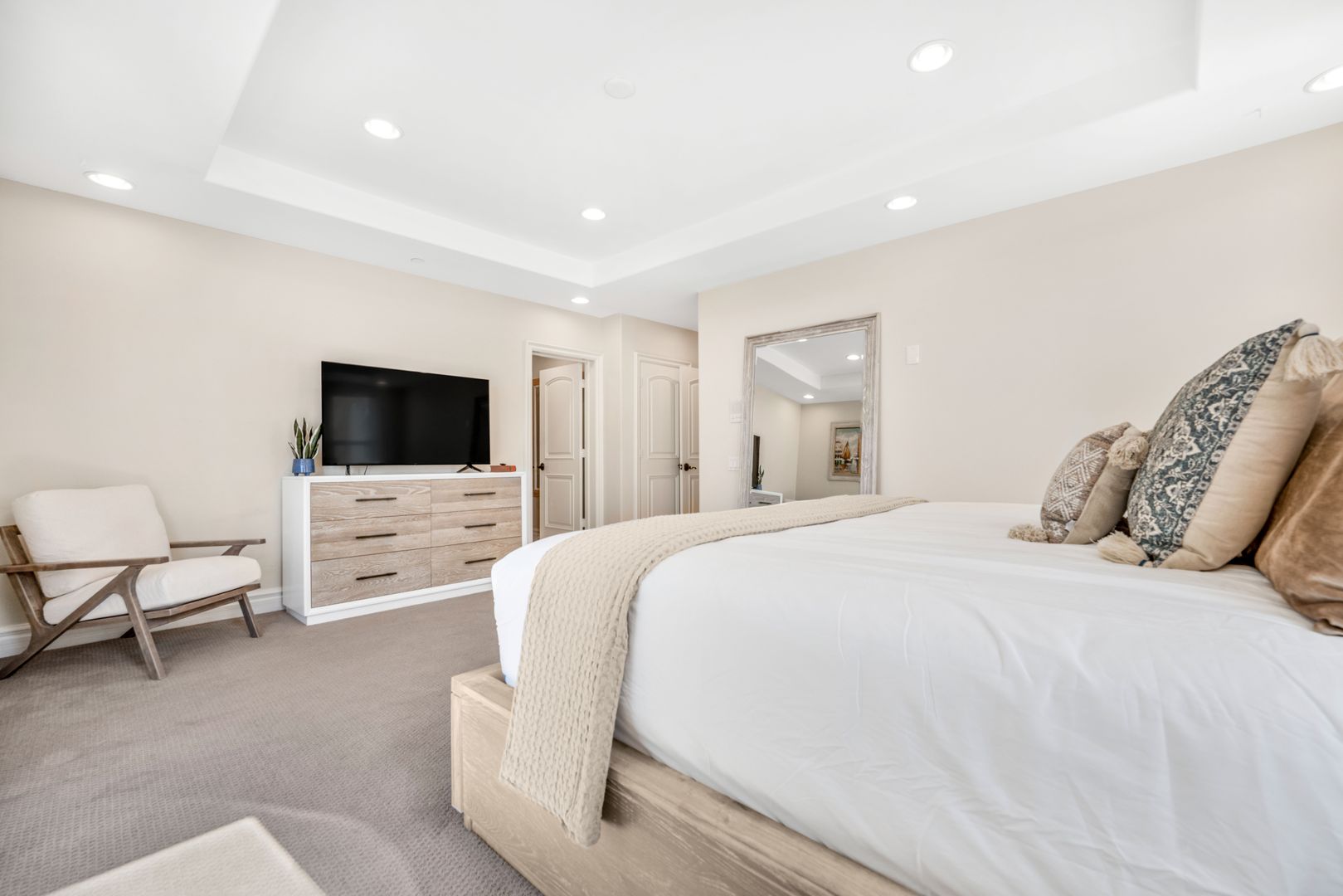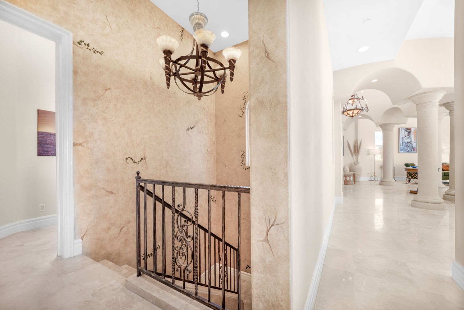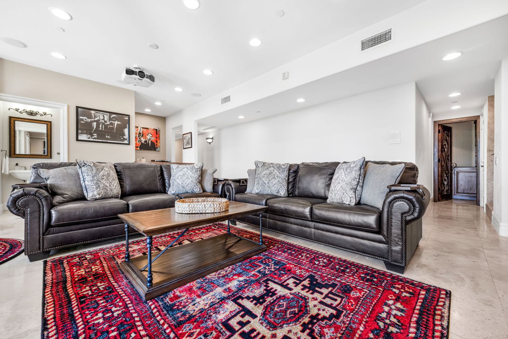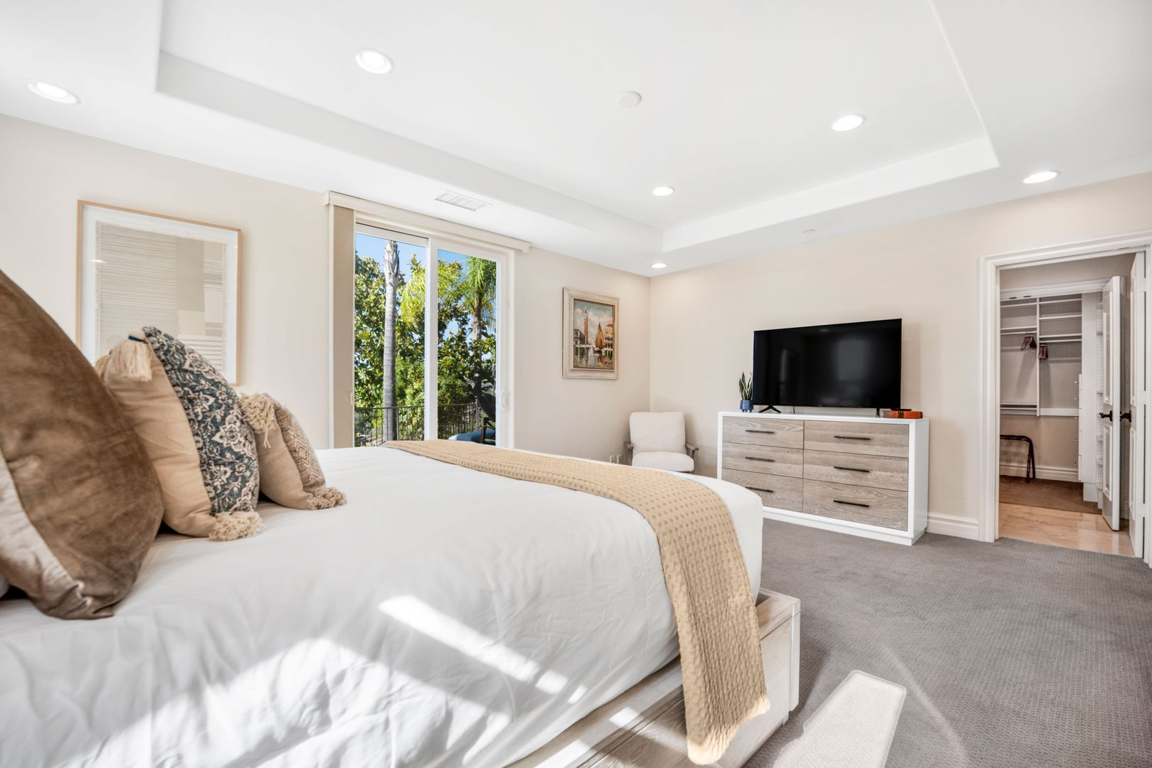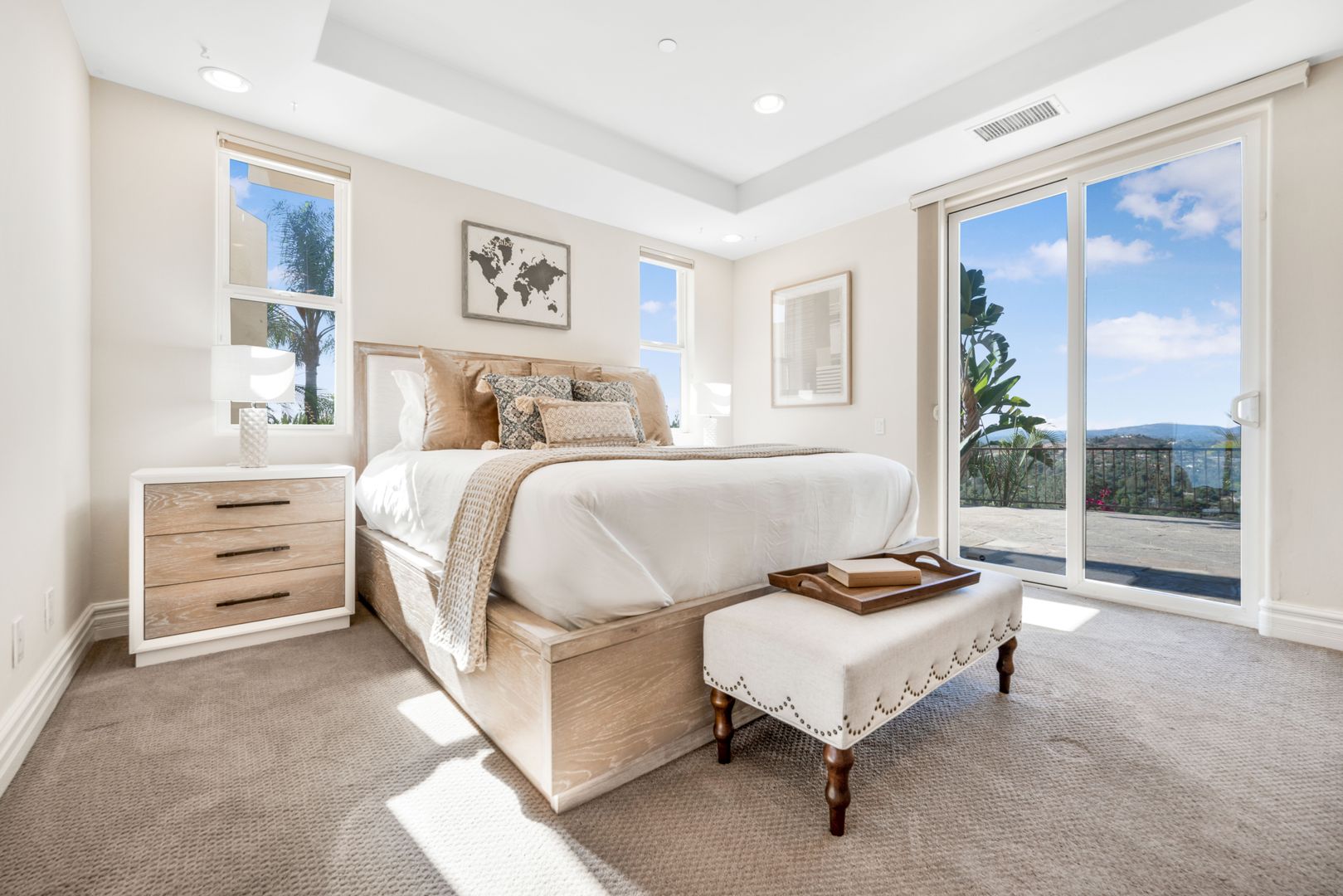 As you enter the 5062 square foot home you’ll be in awe of the high ceilings, the gorgeous columns and arches in the rotunda and the exquisite attention to detail throughout. Large east and west facing windows bring in generous natural light to enjoy the beautiful California sunshine. Just outside the living and family room is a spacious 1000 square foot balcony accessed by multiple sets of french doors to enjoy the views. The chef’s kitchen with stainless steel appliances features an extra-large fridge, double ovens perfect for creating large meals for party guests, an island in the center of the kitchen and serving counter just off the dining nook. You may choose to have an informal meal right there by the kitchen or take advantage of the beautiful 12 person dining table for a classy dinner just around the corner.