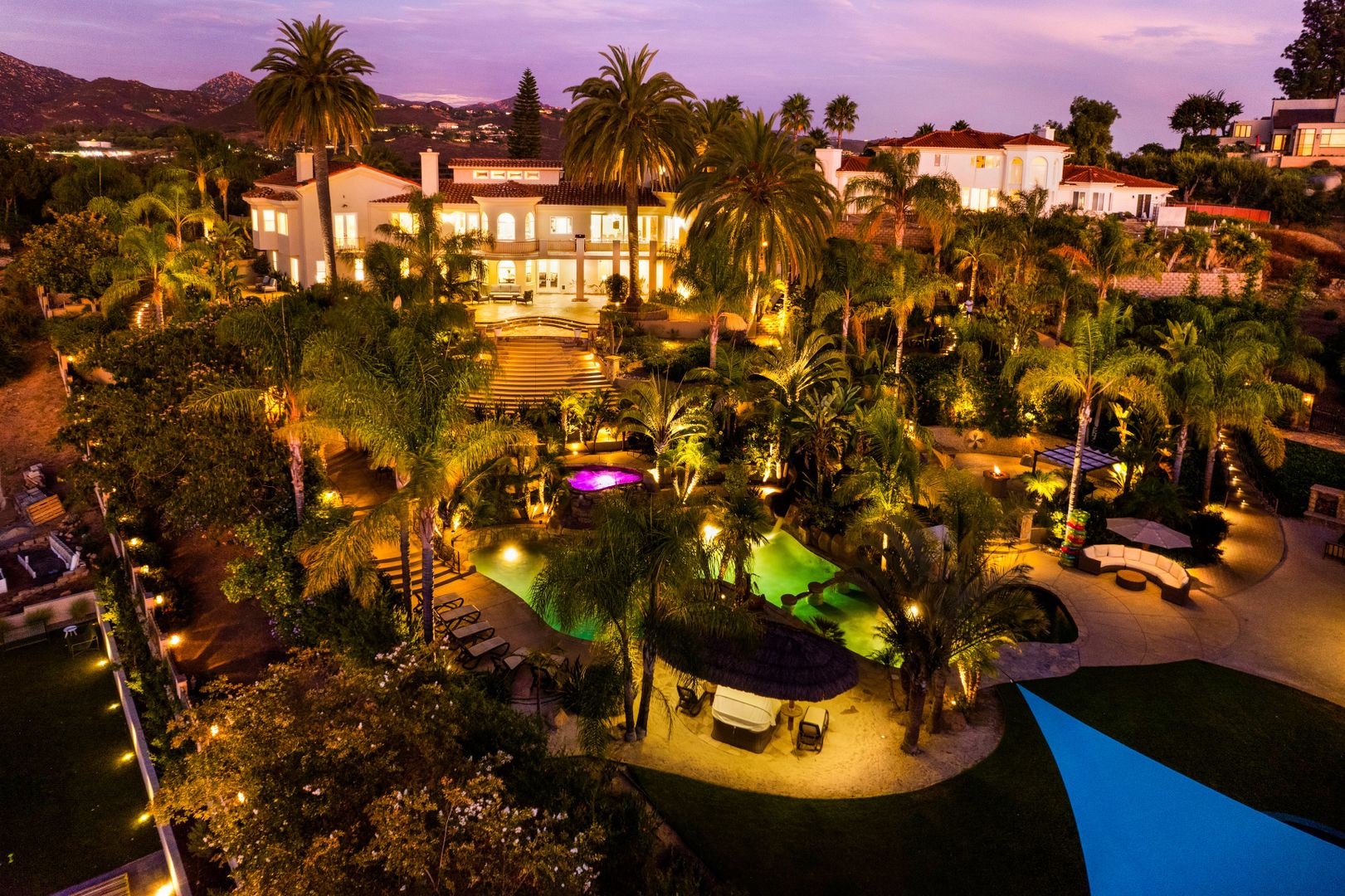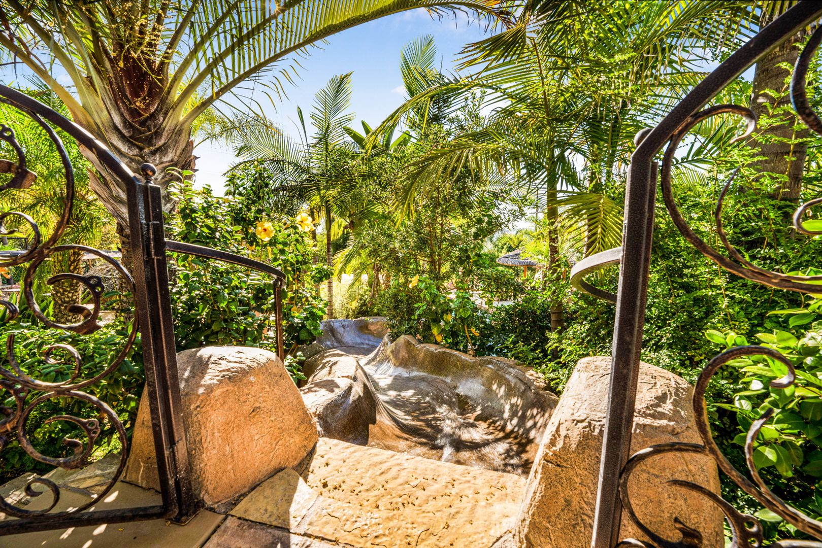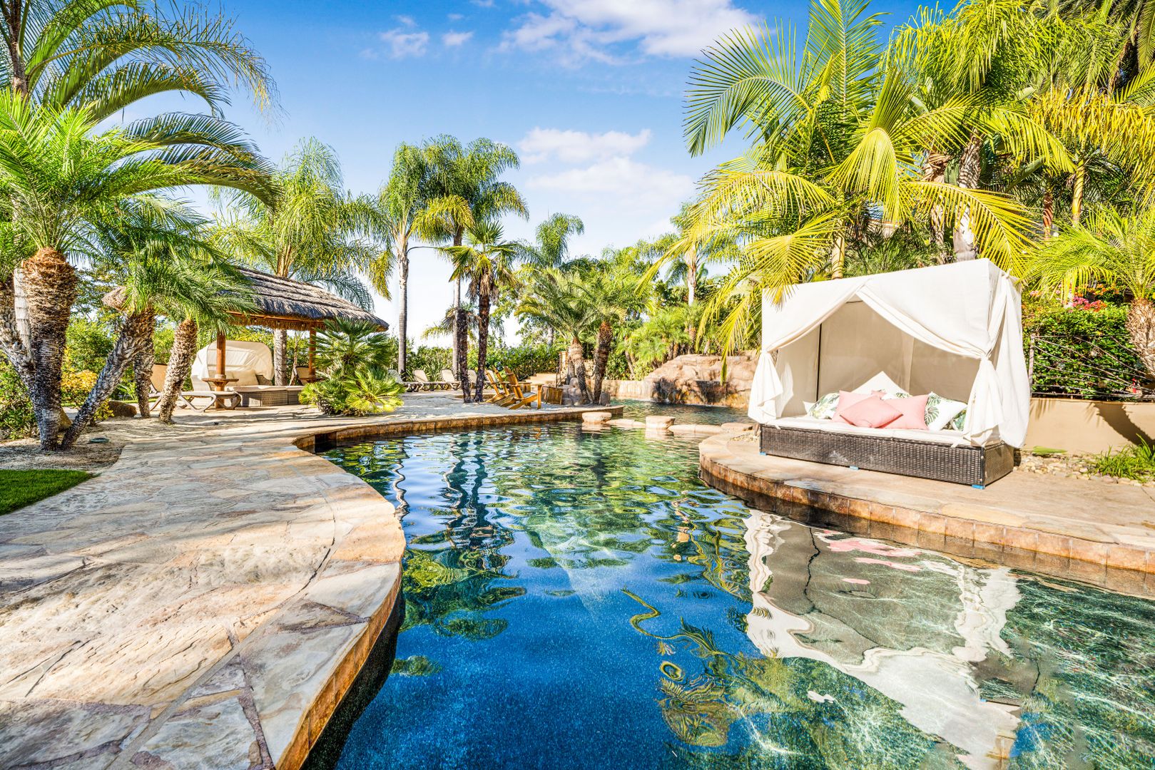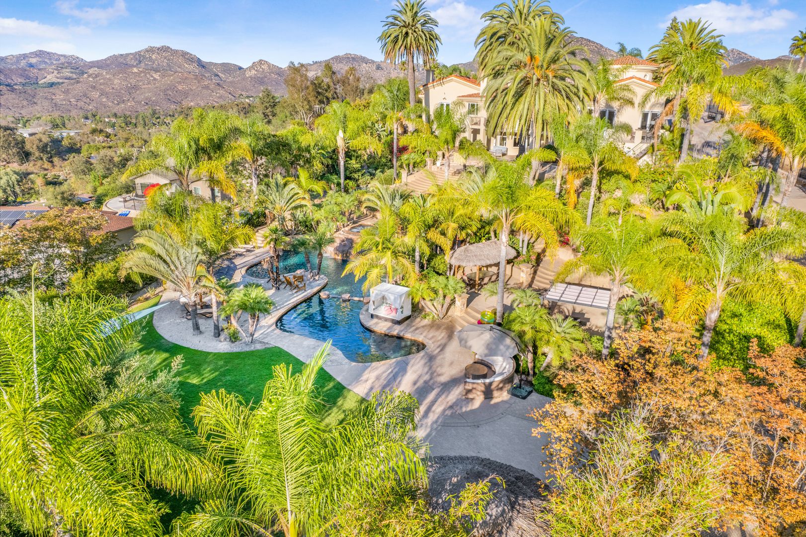 Welcome to your own private resort in a tropical paradise! Nestled just 30 minutes northeast of downtown San Diego and the San Diego airport and close to beach communities, Seaworld, the San Diego Zoo and Legoland you’ll find the idyllic community surrounding Lake Poway. Quiet and spacious, an architectural masterpiece sits on 1.3 acre grounds with hundreds of manicured trees, 30 foot palms, beautiful plants and flowers situated at the end of a cul-de-sac with sweeping views of Poway and beyond.
